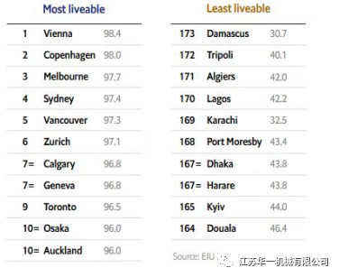 Vienna, Austria, mendahului senarai bandar -bandar yang boleh didiami dengan skor keseluruhan 98.4 mata, dan menerima markah penuh dalam empat daripada lima item pemarkahan.